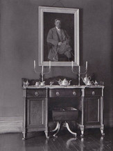 The concept of a dining room, a separate room with permanent furniture for dining, evolved in the late 18th century and new forms, such as the sideboard, were created for functional purposes. In 1788 George Hepplewhite wrote in “The Cabinet-Maker and Upholsterer’s Guide” that “THE great utility of this piece of furniture… renders a dining room incomplete without a sideboard.” When George Clarke "The Builder" set about ordering furniture for his townhouse in Albany, he was billed 60 pounds, or approximately $150, for this sideboard from Albany cabinetmaker John Meads. There were many variations in the form of sideboards at the time, and Clarke chose the pedestal end design with a central opening in which he could place his wine cooler. The sideboard served as a small, elegant pantry, providing space on the top for whatever ceramics, glasses, silver, and food were needed at the meal, while the drawers and cupboards provided storage for extra silverware, plates, napkins, and tablecloths. When he moved to Hyde Hall in 1819, Clarke brought the sideboard with him, and it has been at Hyde Hall ever since.